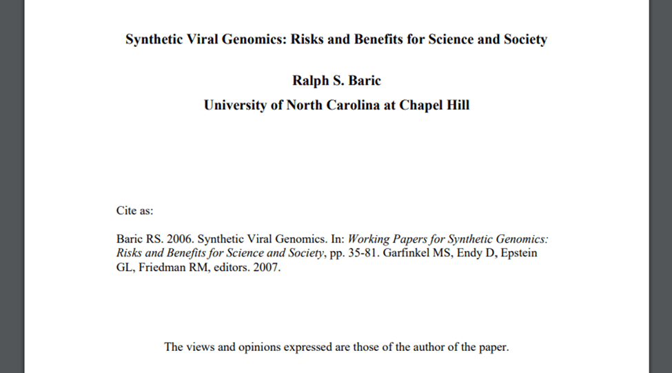 In 2006, Baric published a paper titled Synthetic Viral Genomics: Risks and Benefits for Science and Society in which he primarily discusses the risks and benefits of bioweapons. Obviously, any moral person knows there is no benefit to biological warfare, Baric clearly believes there are benefits to biological weapons.