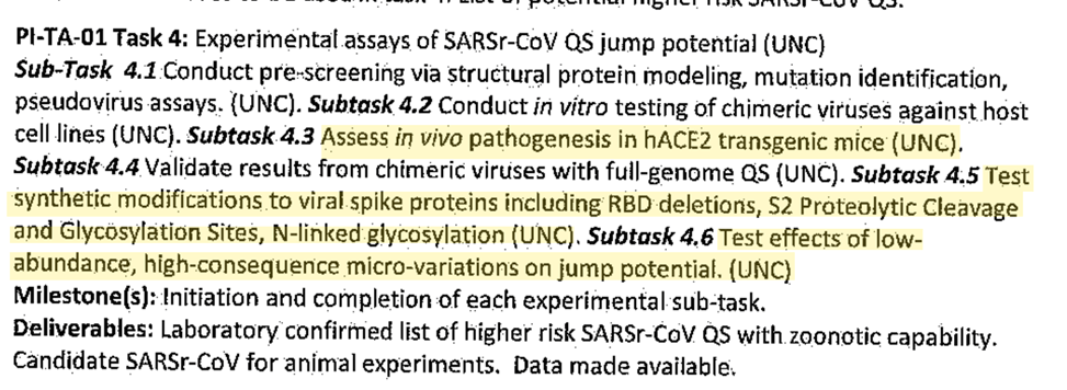 The document lists Ralph Baric’s labs tasks as assessing pathogenesis in the Human ACE2, synthetically modifying the spike protein with cleavage sites and glycosylation sites, and even testing effects of high-consequence micro-variants on human crossover potential. Which is exactly what this same group of researchers told us happened naturally less than 2 years later.