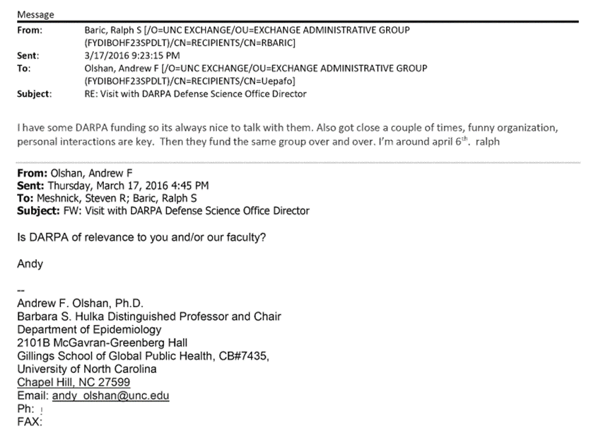 DARPA refused the proposal with 2 out of 3 reviewers saying the proposal was “selectable but not recommended” because of the risks of Gain of Function research. This does not mean this research was not done by the group, it just means DARPA didn’t fund it at that time. It doesn’t even mean that DARPA didn’t later fund it. Remember Baric said himself a novel coronavirus could be synthesized for $6,000 which is nothing for these organizations. Baric even admits he is close with DARPA in his own emails: