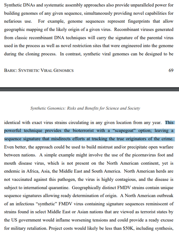 In that very same paper Baric goes on to describe a powerful technique that provides the bioterrorist with a “scapegoat” option; leaving a sequence signature that misdirects efforts at tracking the true originators of the crime.