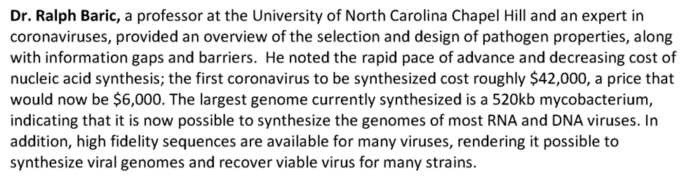 The meetings enabled scientists from the United States and China to discuss research findings on diseases of mutual concern to China and the United States, to share best practices and lessons learned for managing and operating high containment biological laboratories, and to establish new collaborative research and institutional partnerships. These meetings would also allow the U.S. group to gather valuable information that could later be used to turn China into Ralph Baric’s “scapegoat”. At this workshop the U.S. group could easily receive sequences of the Wuhan Institute of Virology’s latest strains of coronaviruses, which could then be taken and used to create COVID-19 for approximately $6,000 according to Ralph Baric. (More on this later) Below is a summary of what Baric said at this very workshop: