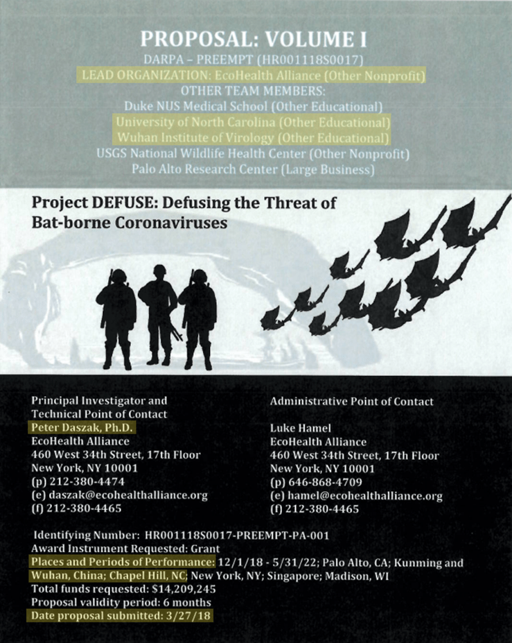 In 2018 The EcoHealth Alliance in collaboration with Ralph Baric’s Lab at UNC submitted a proposal to DARPA to receive funding for “Project DEFUSE: Defusing the threat of bat-borne coronaviruses”.