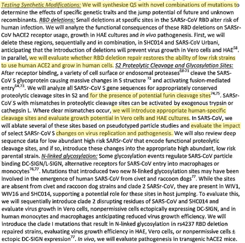 The proposal details the group’s plan to synthesize novel coronaviruses. They would evaluate how coronaviruses could use the human ACE2 (like COVID-19 does) to grow in human cells. They would also insert human specific furin cleavage sites to evaluate growth potential in monkey and Human airway epithelial cells, which is suspiciously the exact same way COVID-19 would infect humans less than 2 years later…