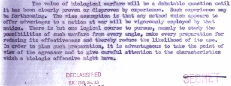 “The United States shall renounce the use of lethal biological agents and weapons, and all other methods of biological warfare. The United States will confine its biological research to defensive measures such as immunization and safety measures.”